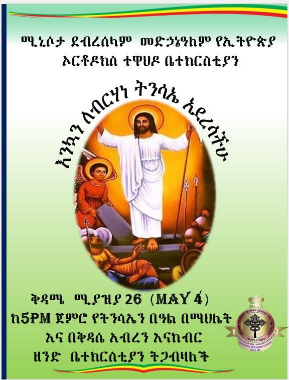 ቅዳሜ ሚያዝያ 26, 2016 ዓ.ም. (Saturday May 4, 2024) ከ 5 ፒ.ኤም. ጀምሮ የትንሳኤን በአል በደብረሰላም መድኃኔዓለም የኢትዮጵያ ኦርቶዶክስ ተዋህዶ ቤተክርስትያን በመገኘት በማህሌት እና በቅዳሴ እብረን እናክብር!