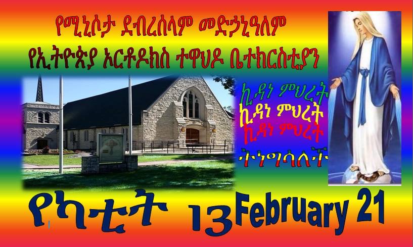 Uncategorized የኪዳነ ምህረት ንግስ February 17, 2016 Admin ቅዳሜ February 20, 2016 ከ4PM ጀምሮ ዋዜማ እሁድ February 21, 2016 ከ3AM ጀምሮ ማህሌት፣ቅዳሴ፣ስብከት እና ዑደት